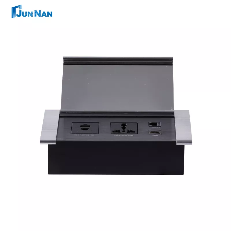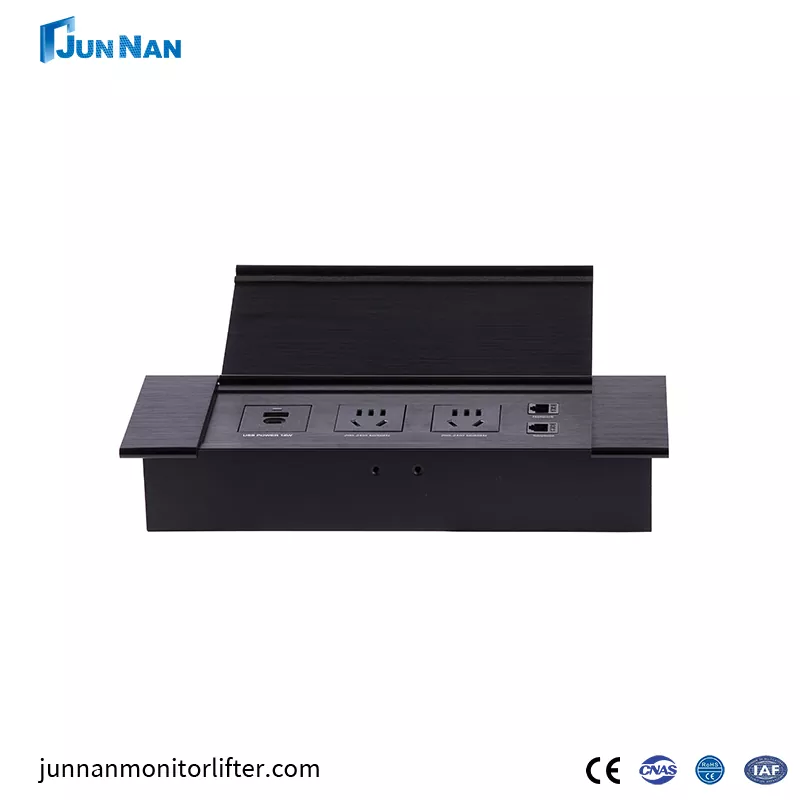 Pop-up desktop-stopcontact bespaart ruimte Dankzij het pop-up-ontwerp kan het in het bureaublad of aan de muur worden verborgen wanneer het niet in gebruik is, waardoor het geen extra ruimte in beslag neemt en de omgeving netjes blijft. Het komt omhoog en trekt zich terug door middel van een interne mechanische structuur. Wanneer het nodig is, drukt u op de relevante knop of activeert u het apparaat en het stopcontactgedeelte verschijnt; bedien hem na gebruik opnieuw om hem in te trekken en te verbergen. Multifunctioneel opladen Uitgerust met een USB-poort, kan hij mobiele telefoons, tablets en andere elektronische apparaten rechtstreeks opladen zonder dat er een extra oplader nodig is. Door gebruik te maken van hoogwaardig brandwerend materiaal en een overbelastingsbeveiliging, worden veiligheidsrisico's veroorzaakt door kortsluiting en overbelasting effectief voorkomen. Wanneer de stroom bijvoorbeeld het draagvermogen van het stopcontact overschrijdt, schakelt het stopcontact automatisch de stroom uit om aangesloten apparaten en gebruikers te beschermen. Verbeterde veiligheids-pop-up-aansluitingen verminderen tot op zekere hoogte het risico dat kinderen per ongeluk de krik aanraken. Sommige producten zijn voorzien van overbelastingsbeveiliging en andere veiligheidsvoorzieningen. Ze kunnen in de groothandel worden gekocht of particulier op maat worden gemaakt voor klanten. Daarnaast beschikken onze Junan apparaten over een aantal certificaten, zoals CCC, CE-certificering, ROHS, ISO-certificering meerkeuzecertificaat. Onze producten zijn veilig en van hoge kwaliteit, met exportkwalificatie, directe verkoop in de fabriek, gunstige prijs, eigen fabriek en bestaan al vele jaren.